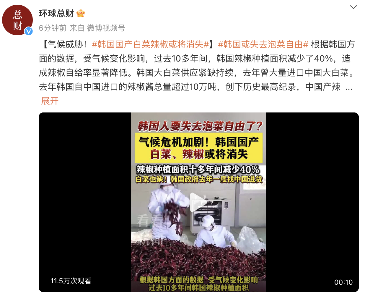 根据韩国方面的数据,受气候变化影响,过去10多年间,韩国辣椒种植面积减少了40%,造成辣椒自给率显著降低。韩国大白菜供应紧缺持续,去年曾大量进口中国大白菜。去年韩国自中国进口的辣椒酱总量超过10万吨,创下历史最高纪录,中国产辣椒粉一度占四成市场份额。韩国方面称,照此趋势发展下去,韩国国产白菜、辣椒或将从韩国人的餐桌上消失,有从业者引入智能农场等栽培方式,以及研发适应性更强的品种,希望应对气候变化带来的粮食危机。